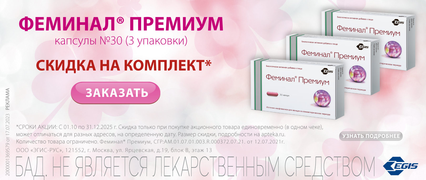 Именно изофлавоны красного клевера являются основным действующим веществом растительного средства Феминал® Премиум. Данная биологически активная добавка широко используется как у женщин с ранними признаками менопаузы, так и у женщин в поздней постменопаузе. Для достижения ощутимого эффекта необходимо в день принимать от одной до трёх капсул Феминал® Премиум. Курс приёма определяется индивидуально, при этом длительность применения может превышать 12 месяцев без негативного влияния на здоровье женщины16.